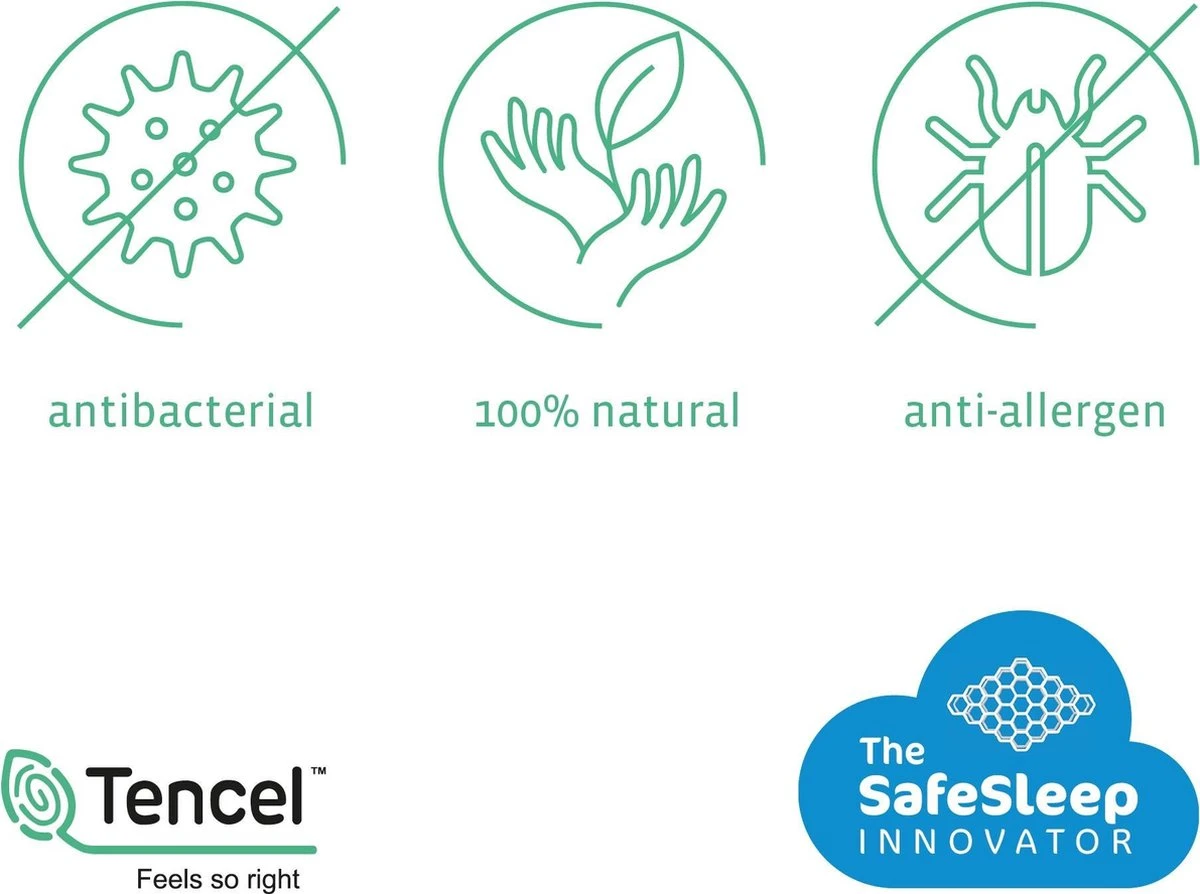 Het ECOlution matras geeft je kindje de beste rug ondersteuning en optimaal comfort. De ECOlution matraskern is van superieure kwaliteit. Het ECOlution matras is zeer veerkrachtig en heeft een lange levensduur. Om de matraskern zit een luxe matrashoes van TENCEL® met wolkjes motief. De bijzondere eigenschappen van TENCEL® maken veilig slapen nog aangenamer. TENCEL® is 100% natuurlijk en voelt zijdezacht. TENCEL® werkt anti-bacteriëel, vocht absorberend en warmte regulerend. Zowel de TENCEL® matrashoes als de 3D matrasbeschermer zijn machine-wasbaar op 60°C.