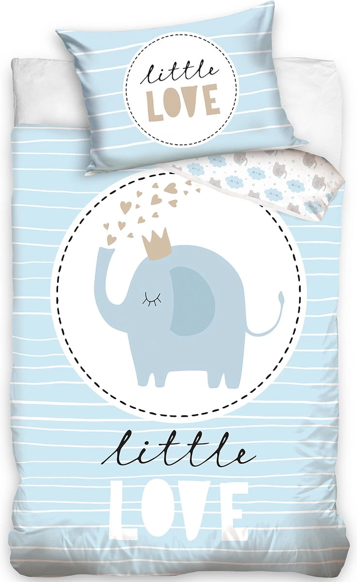 Animal Pictures BABY dekbedovertrek, Olifantje. Fantastisch dekbedovertrek in baby formaat. Op het dekbedovertrek zie je een prachtig design van een klein olifantje tegen een blauwe achtergrond. Zowel het overtrek als de kussensloop sluiten met een rits, dit maakt het dat ondanks veel draaien tijdens het slapen het artikel goed blijft zitten. Dit artikel is bij uitstek geschikt als geschenk bij een baby shower.