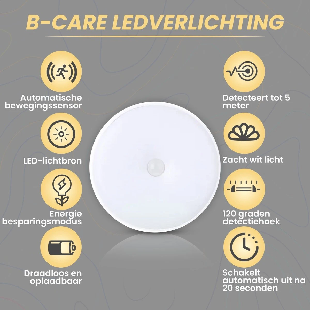 Met de B-care Ledverlichting met Bewegingssensor kunt u voortaan veilig en praktisch door uw huis bewegen. Wanneer er menselijke activiteit binnen 5 meter van het lampje plaatsvindt springt deze automatisch aan. Gedurende deze activiteit blijft het lampje automatisch aan. Wanneer u de plek verlaat, gaat het licht automatisch binnen 20 seconden uit.