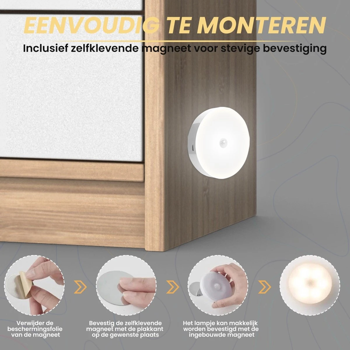 Bij de B-care ledverlichting met sensor wordt geleverd met een zelfklevende magneet. Met de plakkant kan de verlichting worden geplaatst op de gewenste plaats. Wanneer het lampje moet worden opgeladen kan deze makkelijk worden verwijderd door het lampje met de klok mee te bewegen.