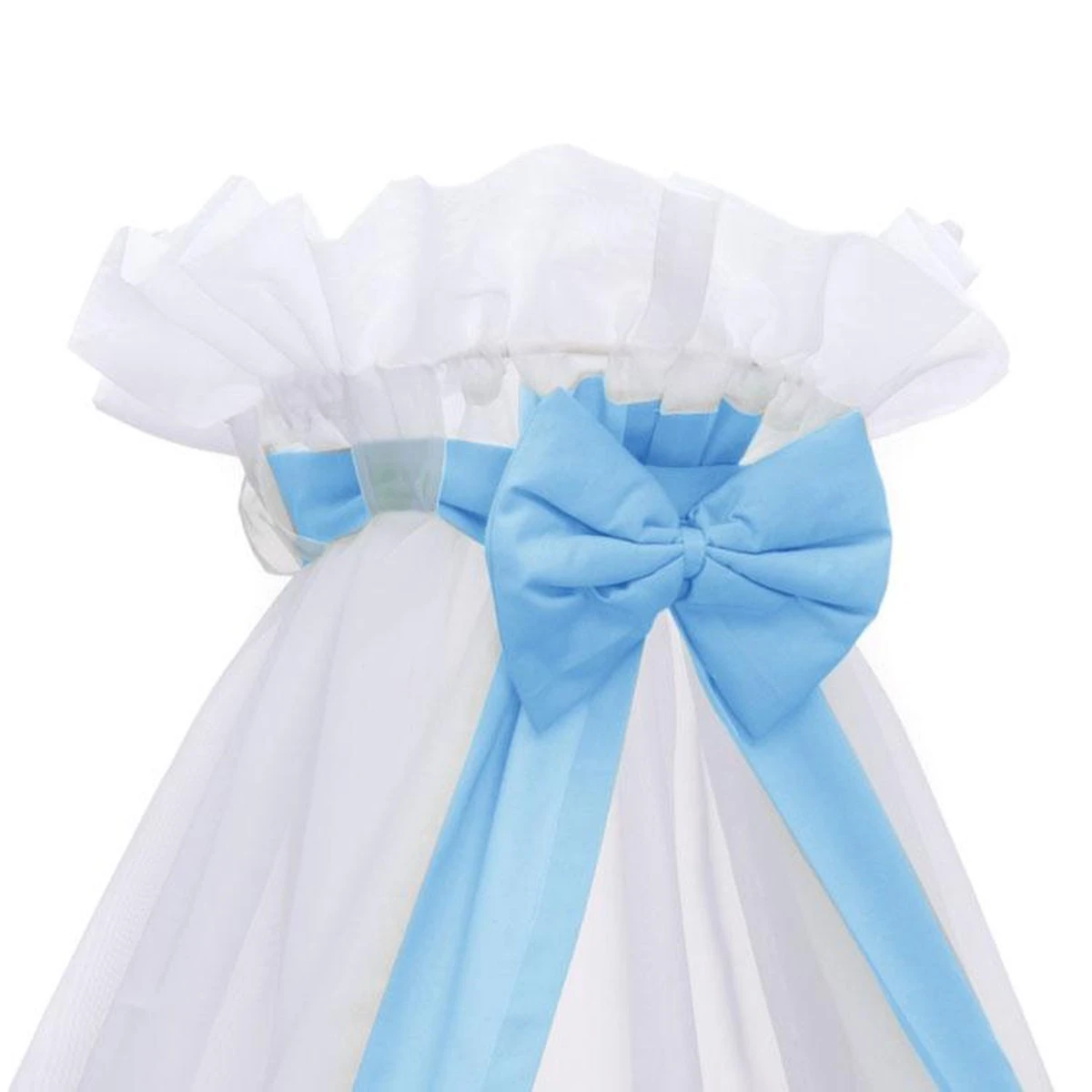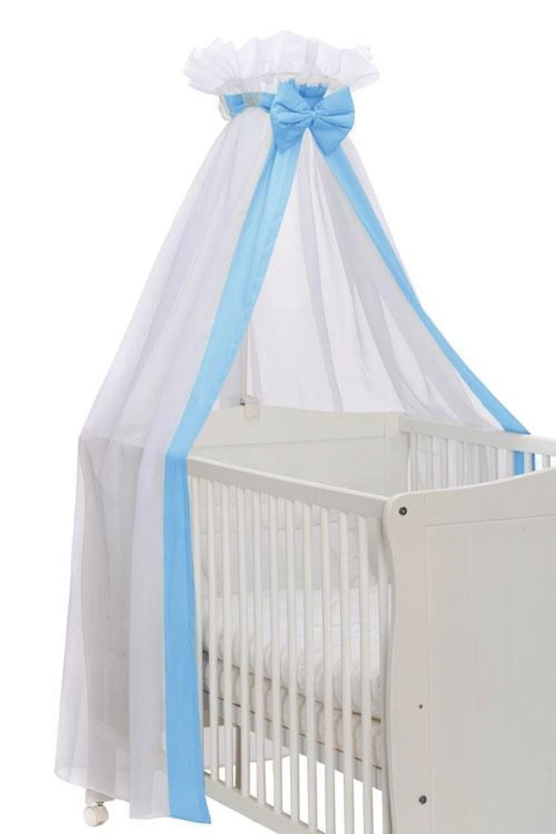 Prachtige, sfeervolle sluier om de wieg of het ledikantje helemaal compleet te maken. De sluier is gemaakt van 100% polyester. Afgewerk met een katoenen bies en sierlijke strik. De sluier heeft onder een diameter van 230 cm. De hoogte van de sluier is 155 cm hoog.