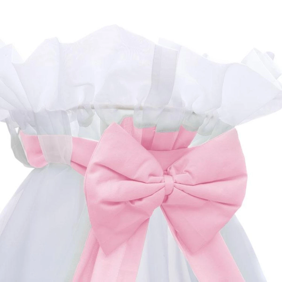 Prachtige, sfeervolle sluier om de wieg of het ledikantje helemaal compleet te maken. De sluier is gemaakt van 100% polyester. Afgewerk met een katoenen bies en sierlijke strik. De sluier heeft onder een diameter van 240 cm. De hoogte van de sluier is 160 cm hoog.