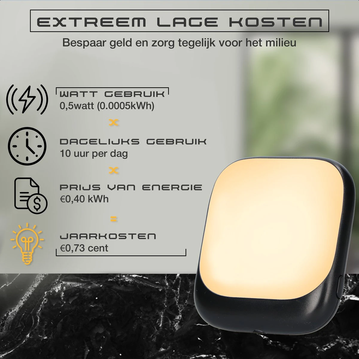 De nachtlamp is voorzien van 0,5W LED lampen en is daarmee ontzettend zuinig in energieverbruik en extreem laag in kosten. Zo heeft de lamp een levensduur van 20.000 uur, als je het lampje 24 uur aan zou hebben staan kost dit nog altijd minder dan €1,- per jaar!
