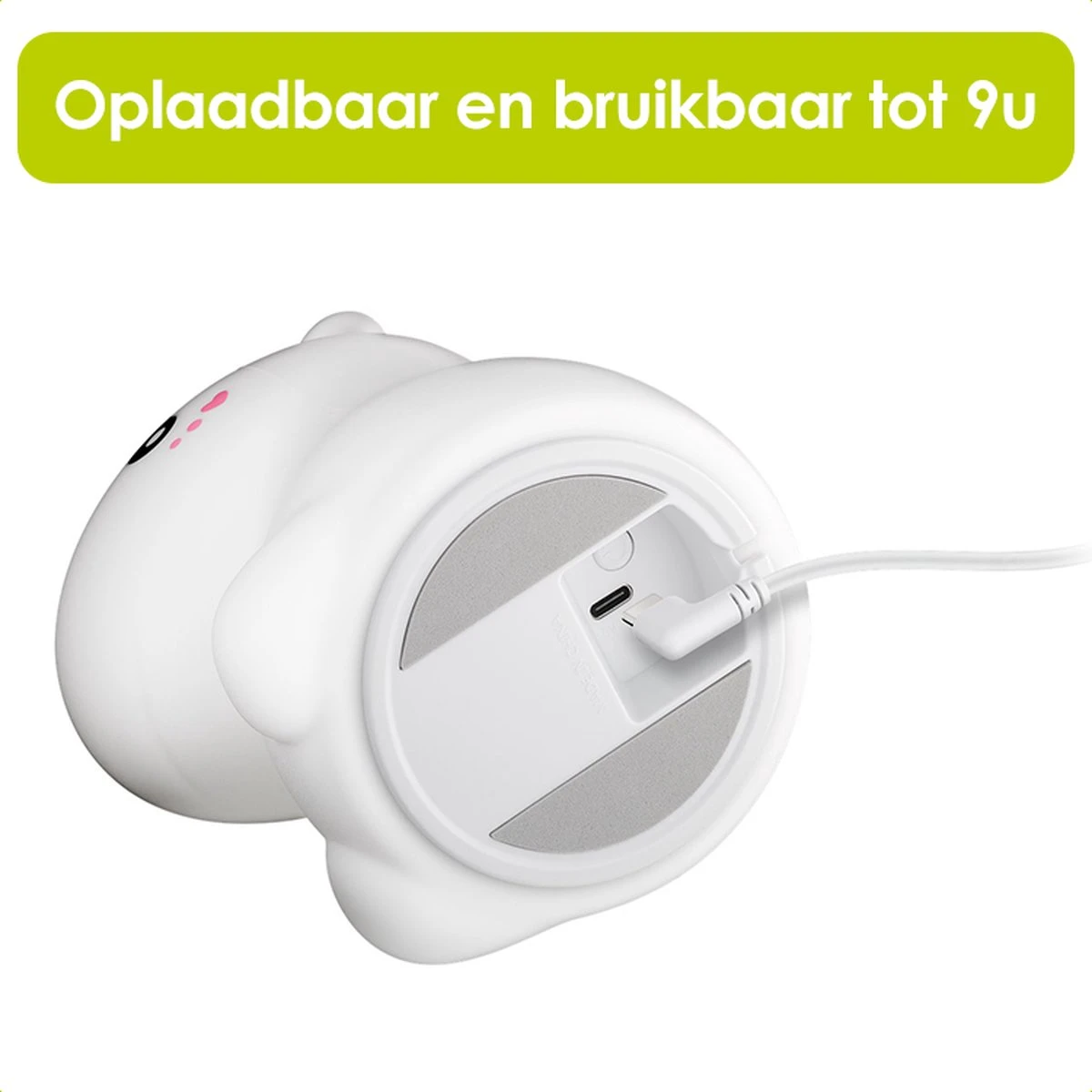 Dit nachtlampje is oplaadbaar, je kunt hem dus neerzetten waar jij wilt. Het lampje geeft ongeveer 9 uur licht als de accu volledig is opgeladen (in circa 3-4 uur). Dat maakt het nachtlampje zeer geschikt voor elke kinderkamer, maar ook voor bijvoorbeeld een autorit in het donker.