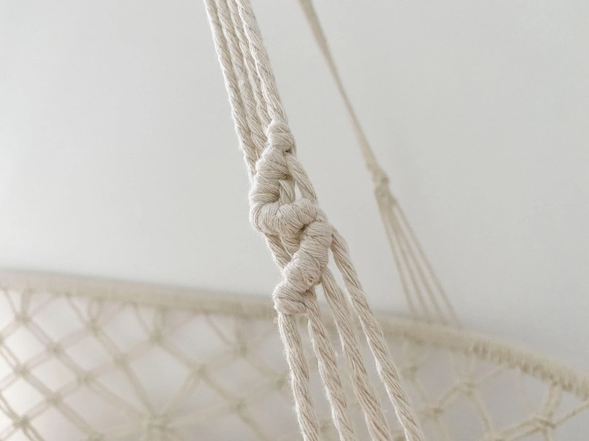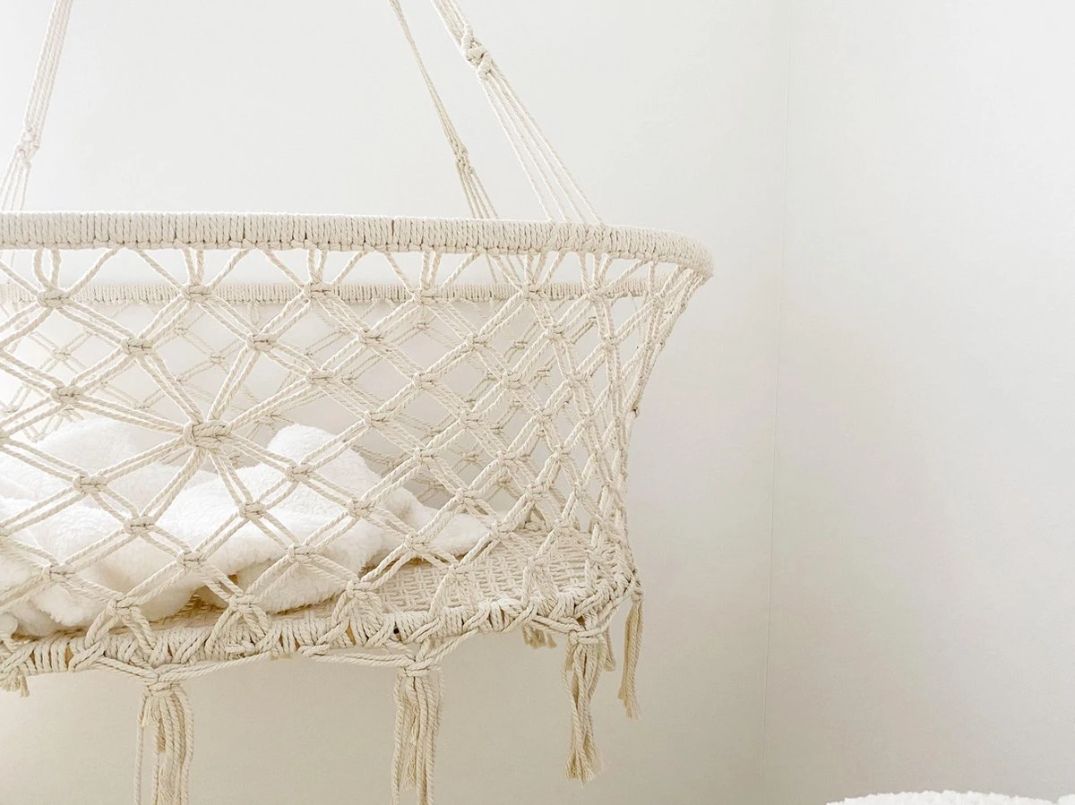 Dit hangwiegje is 100% met de hand gehaakt en wordt volledig gemonteerd geleverd. Je hoeft alleen maar de bevestigingshaak op te hangen en klaar!