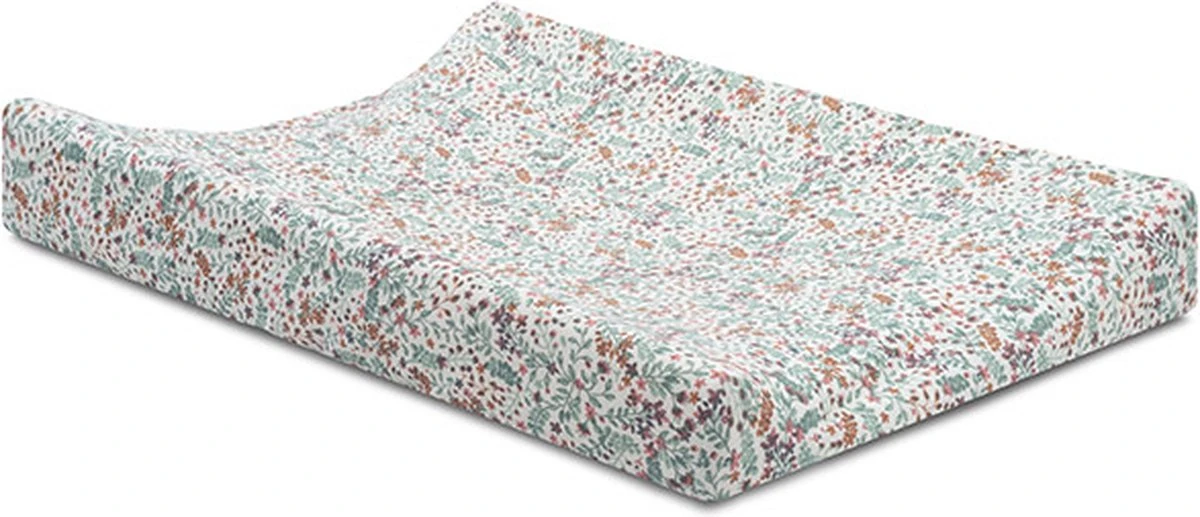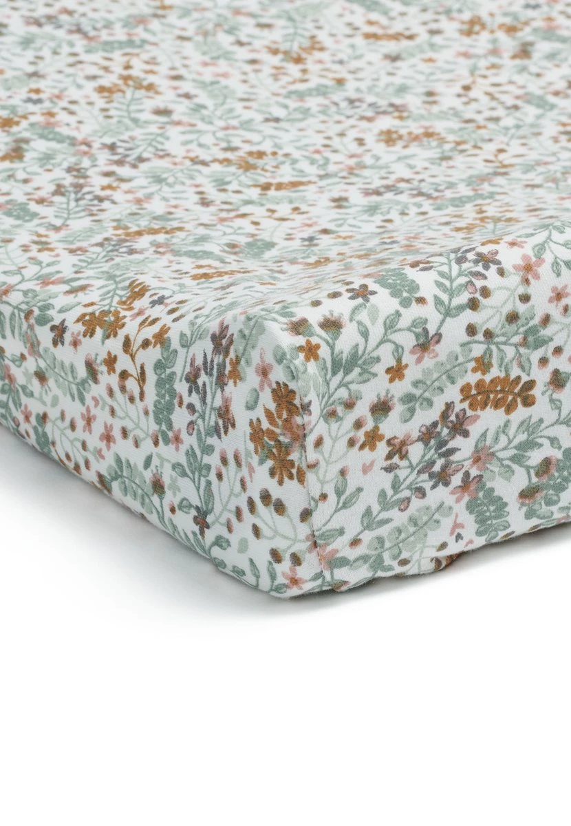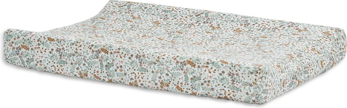 Een romantisch gebloemde jersey hoes die precies om het aankleedkussen past is de meest praktische basic in de babyuitzet. De stof is zacht en rekbaar. Het elastiek in de randen zorgt ervoor dat de hoes goed om het kussen blijft zitten.