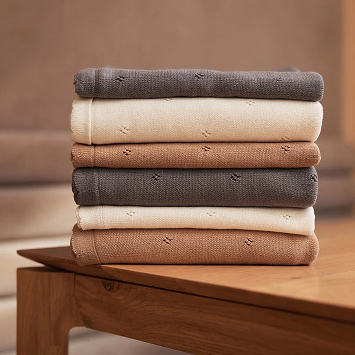 Het Pointelle dekentje shop je in de kleuren ivory, strom grey en biscuit in de formaten 75×100 cm voor de wieg en 100×150 cm in het ledikantje.