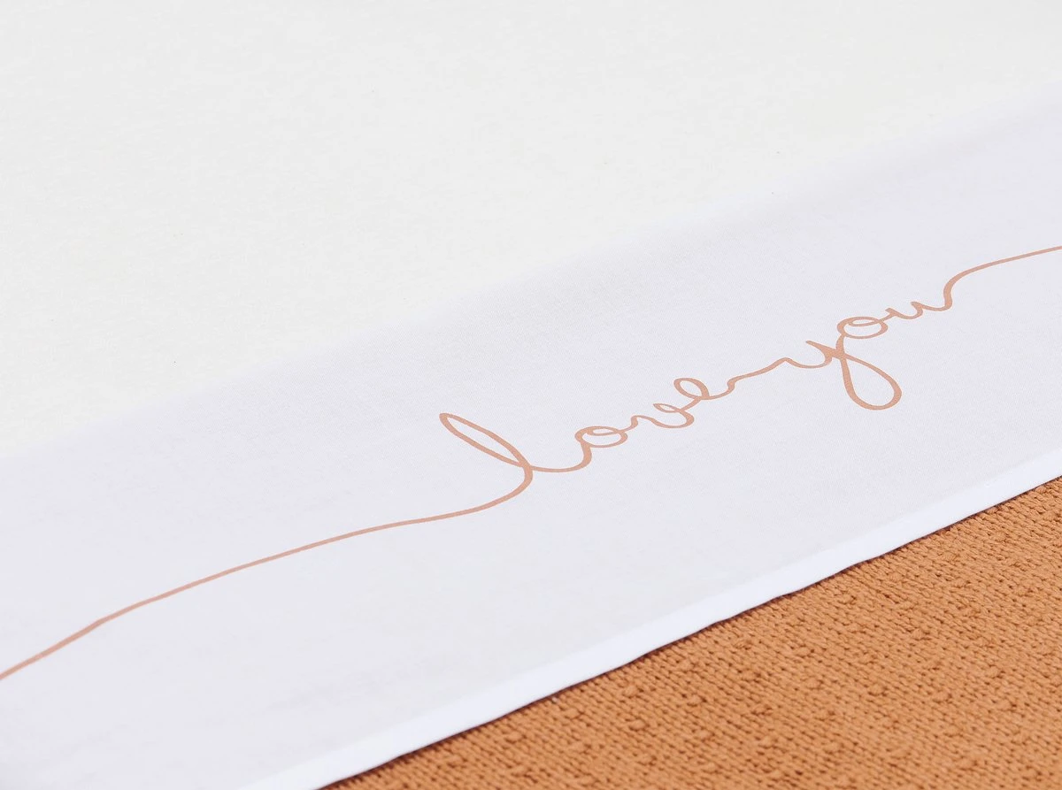 Met een wit lakentje kun je het bedje van jouw baby veilig, kort en strak opmaken. Door de zijkanten van het lakentje onder het matrasje te stoppen, slaapt jouw kleintje niet alleen veilig, maar heeft het ook een geborgen gevoel. Dit lieve lakentje met de tekst ‘love you’ past perfect bij de dekens uit het Basic knit thema en het Bliss knit thema van Jollein.