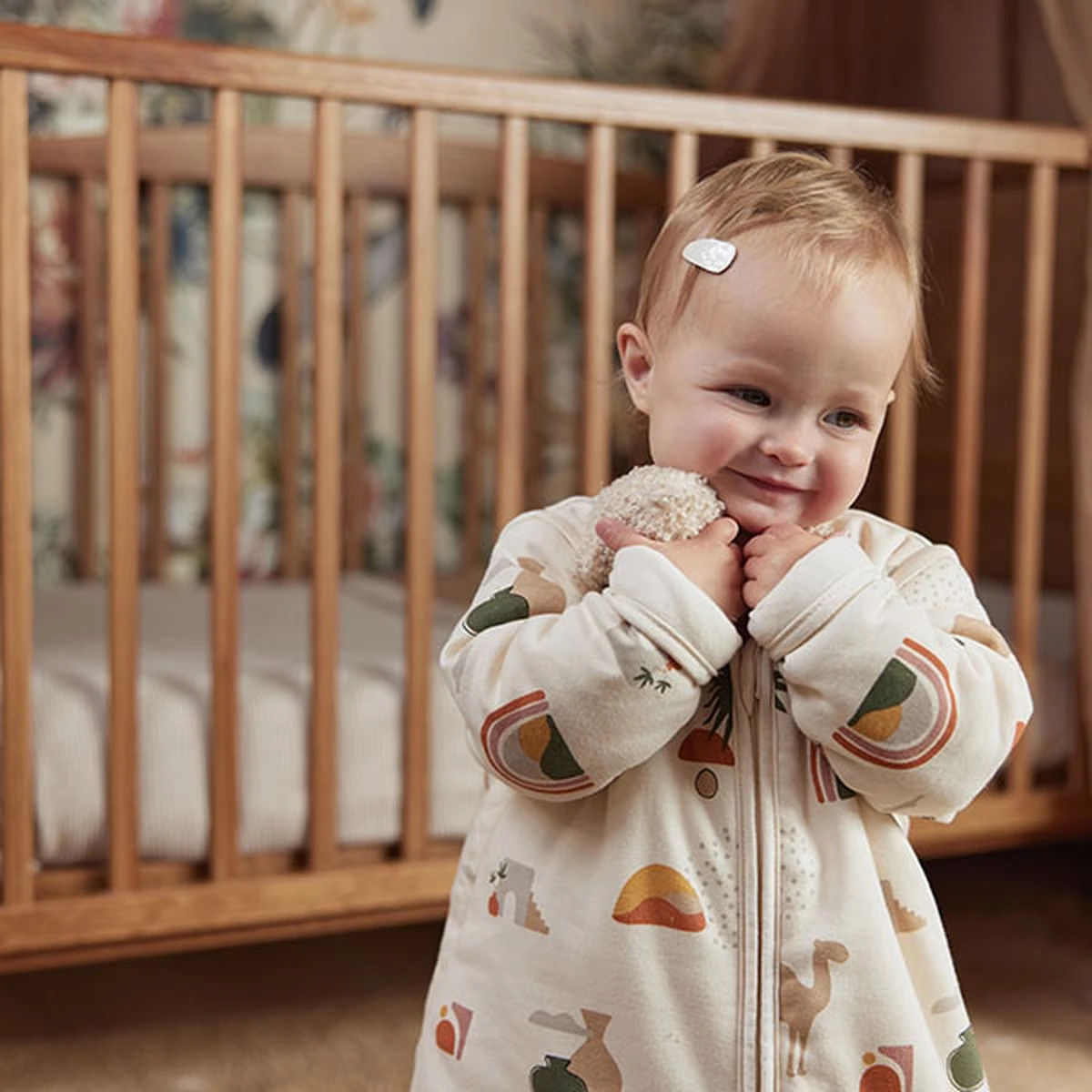 Deze prachtige Middle East print is geïnspireerd op het Midden Oosten. Met het schattige kameeltje, palmboompjes en regenboogje waan je je in de vakantie sferen. Je combineert dit slaapzakje met leuke print met onze Pure Knit dekens.