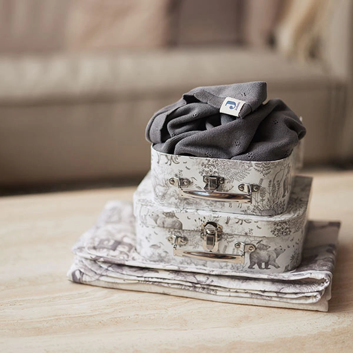 Op elk item zie je het lieve bosdieren printje terug, sommige met een grote panelprint, sommige met een all-over printje. De print heeft een off-white ondergrond met een grijze print.