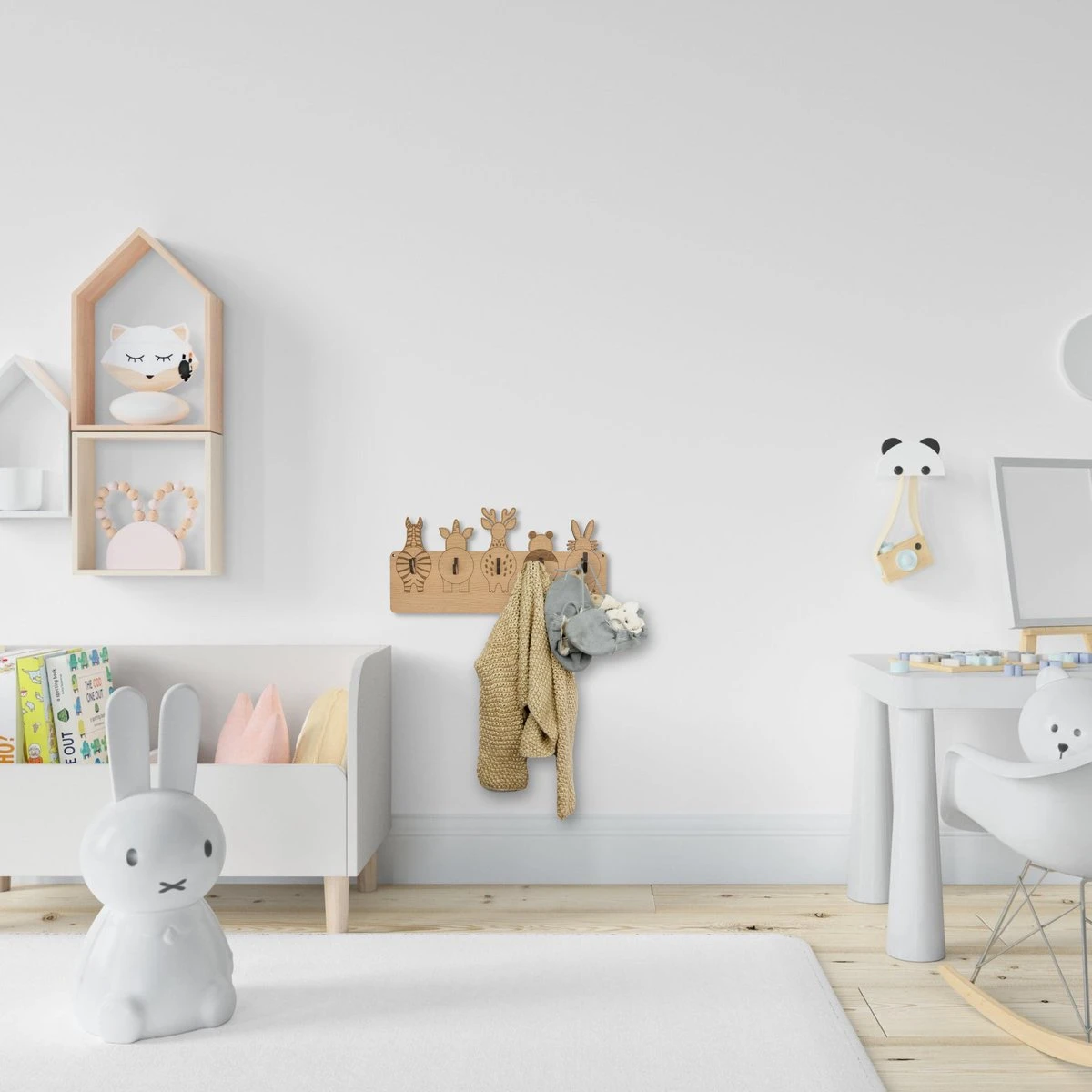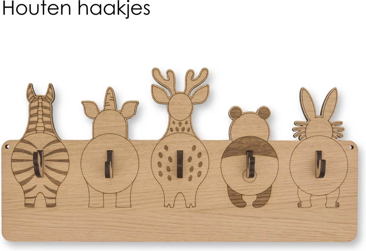 Deze prachtige houten kinderkapstok heeft 5 haakjes, ieder met een eigen (en vooral heel leuk) beestje. Hangt je kleine vandaag zijn jas aan de zebra of toch liever aan de panda? Het is, hoe dan ook, lekker opgeruimd in huis.