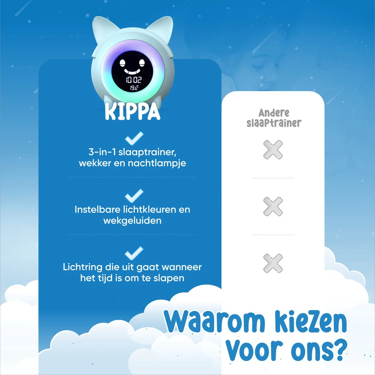 - Alle functies die je nodig hebt – Van nachtwekker tot dutjeswekker, van nachtlamp tot speelkameraadje. Deze slaaptrainer is bedacht met het plezier van een kind in het achterhoofd. Zo is Kippa licht, sterk en veilig maar heeft het bijvoorbeeld ook een kinderslot en geheugenbatterij, mocht de netstroom uitvallen