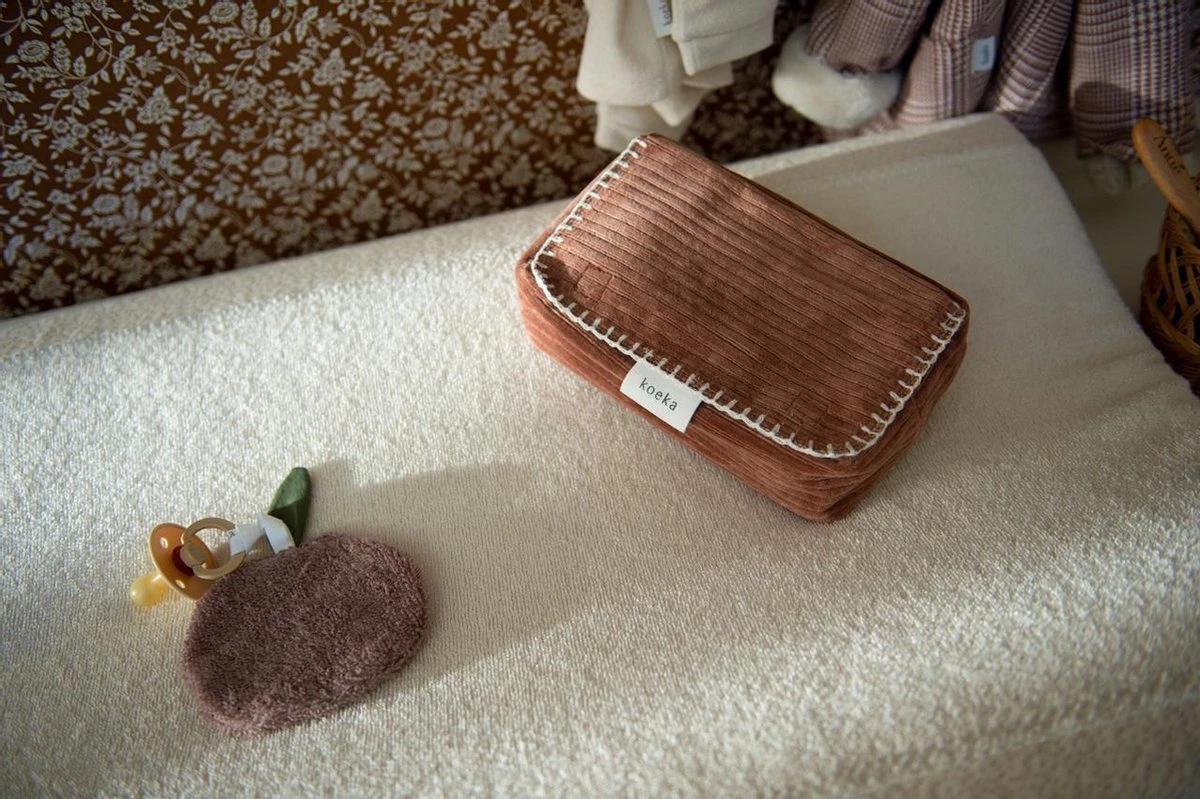 Deze hoes voor babydoekjes is gemaakt van corduroy en afkomstig uit de Vik collectie. De lijnen en het reliëf van de stoer toegepaste corduroy doet denken aan het bergachtige landschap van Vik. Maar hoe ruig de bergen in IJsland ook zijn, de stof is daarentegen super zacht.