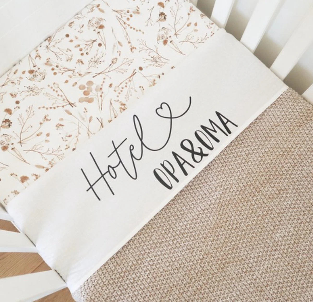 Dit lakentje is bedrukt met de tekst ‘Hotel Opa&Oma’. Je vindt de bedrukking op de omslag.