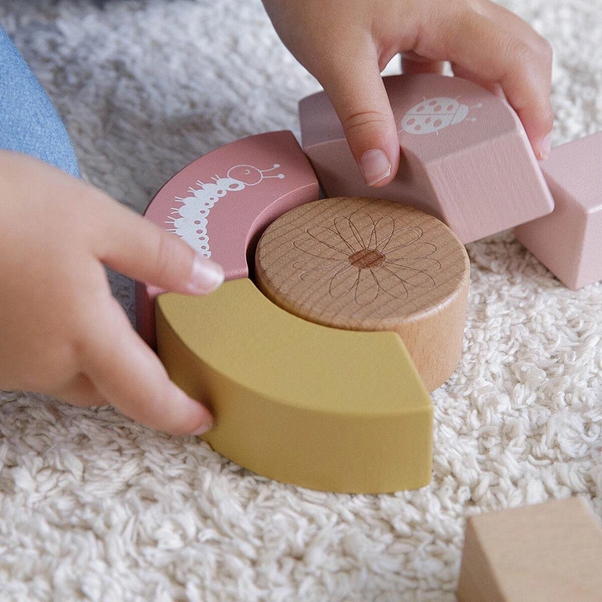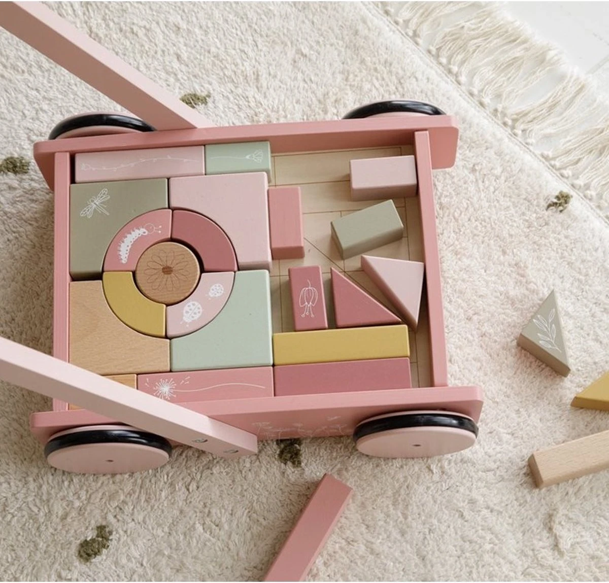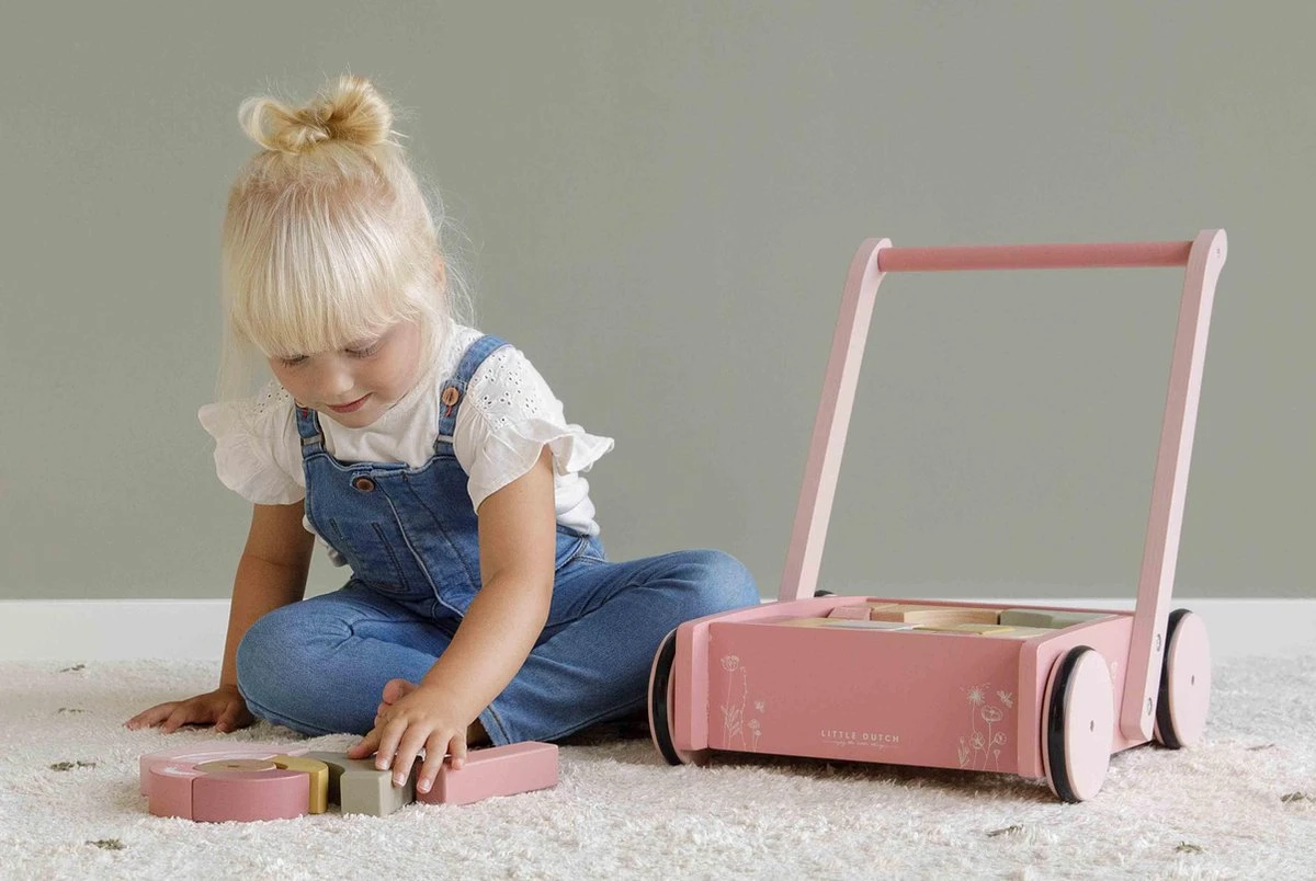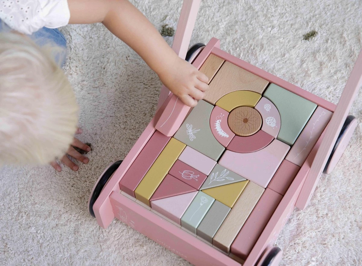 De bloktrolley is voorzien van houten wieltjes en gevuld met gekleurde houten blokken met daarop prachtige tekeningen van bloemen en insecten uit de Wild Flowers collectie. De verschillende maten van de blokken bevorderen de herkenning van kleuren en vormen door kinderen. Het handvat zit op de juiste hoogte voor peuters zodat ze fijn door de kamer kunnen stappen. Deze vrolijke kar vol blokken staat garant voor urenlang bouwplezier.