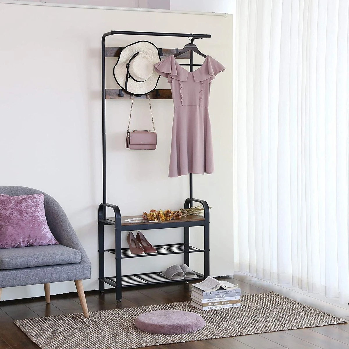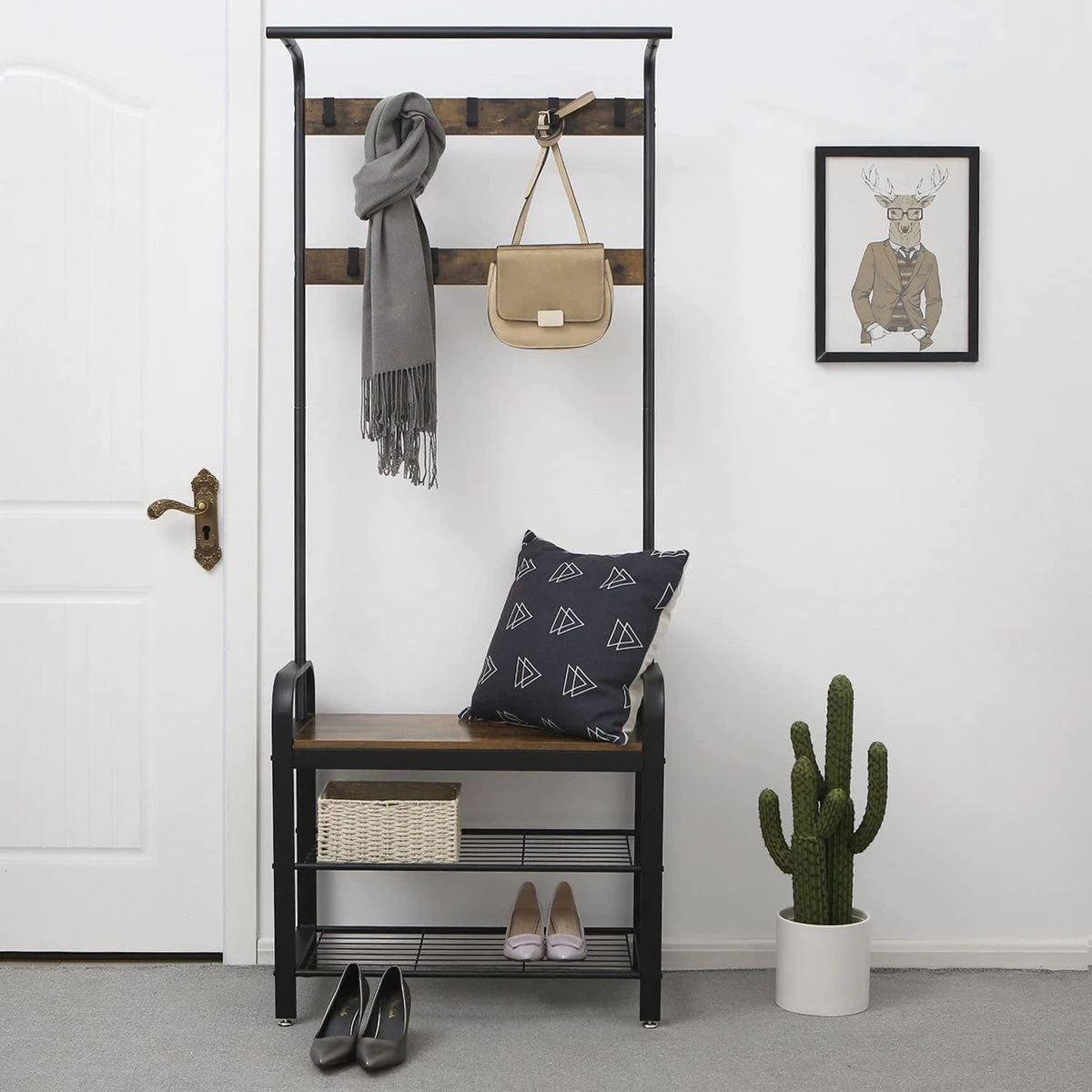 Dit garderoberek verzamelt een kapstok, schoenenrek en legplank in één en dezelfde ruimte.