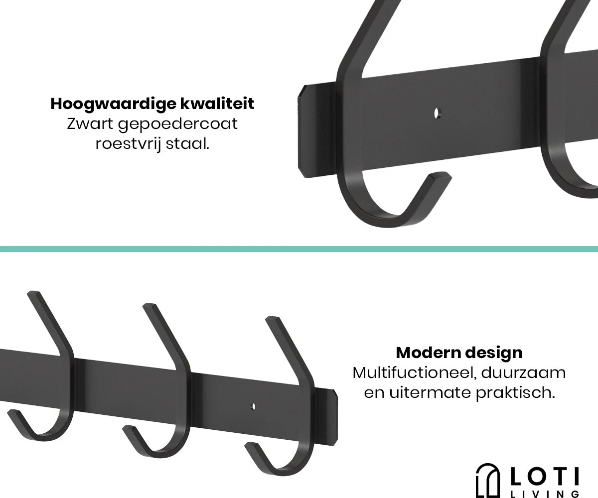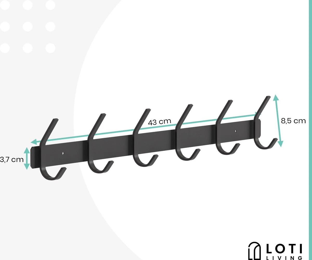 De Loti Living wandkapstok is een echte aanwinst voor je hal, slaap- of badkamer. De kapstok heeft 6 haken om jassen, kleding of handdoeken op te hangen. De kapstok is multifunctioneel; het is niet alleen een muurkapstok, maar kan ook als handdoekrek gebruikt worden. De industriële wandkapstok is zowel stijlvol als praktisch en past in ieder huis. Met de meegeleverde schroeven en 3M tape monteert u de wandkapstok van RVS eenvoudig aan de muur.