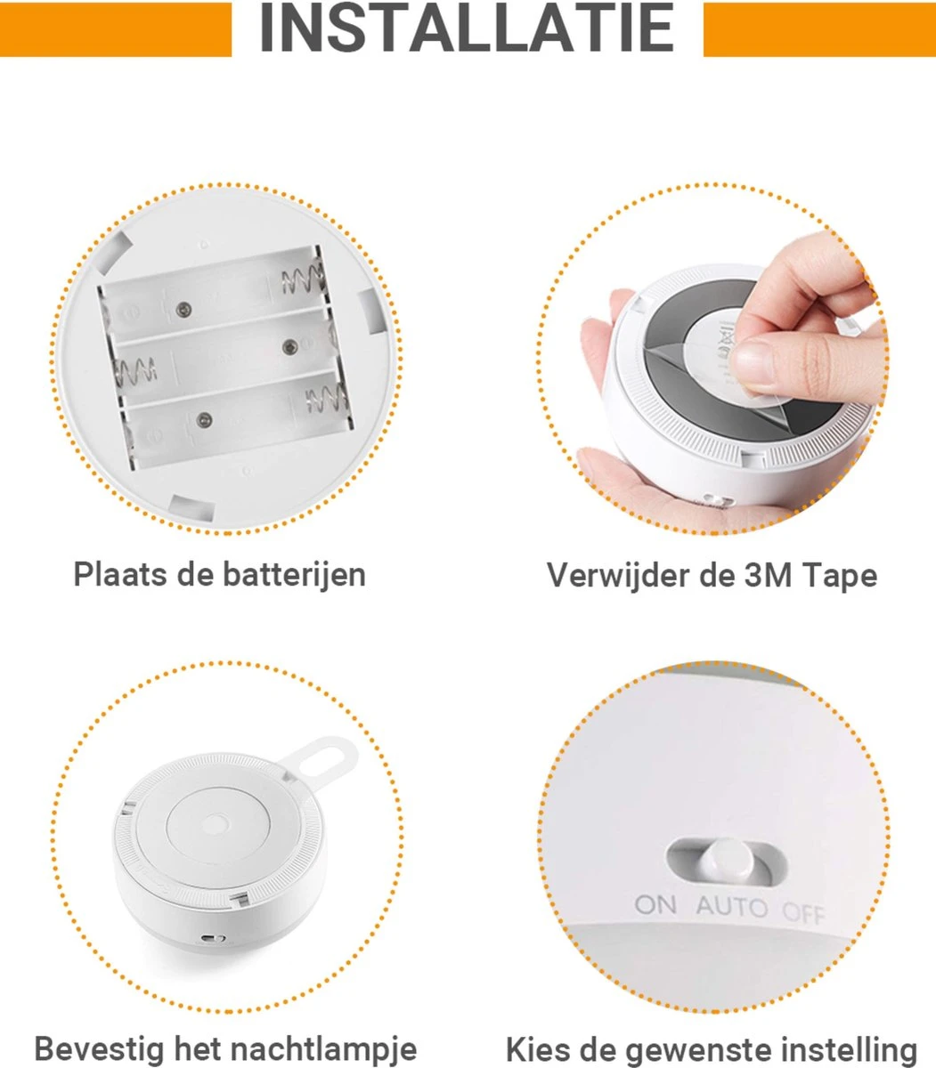 Het nachtlampje heeft een PIR sensor (Passief Infrarood Sensor) deze sensor reageert op beweging en warmte. Zodra je in het detectie bereik komt van 120° schakelt de verlichting automatisch aan. Schakelt automatisch uit na 15 seconden.