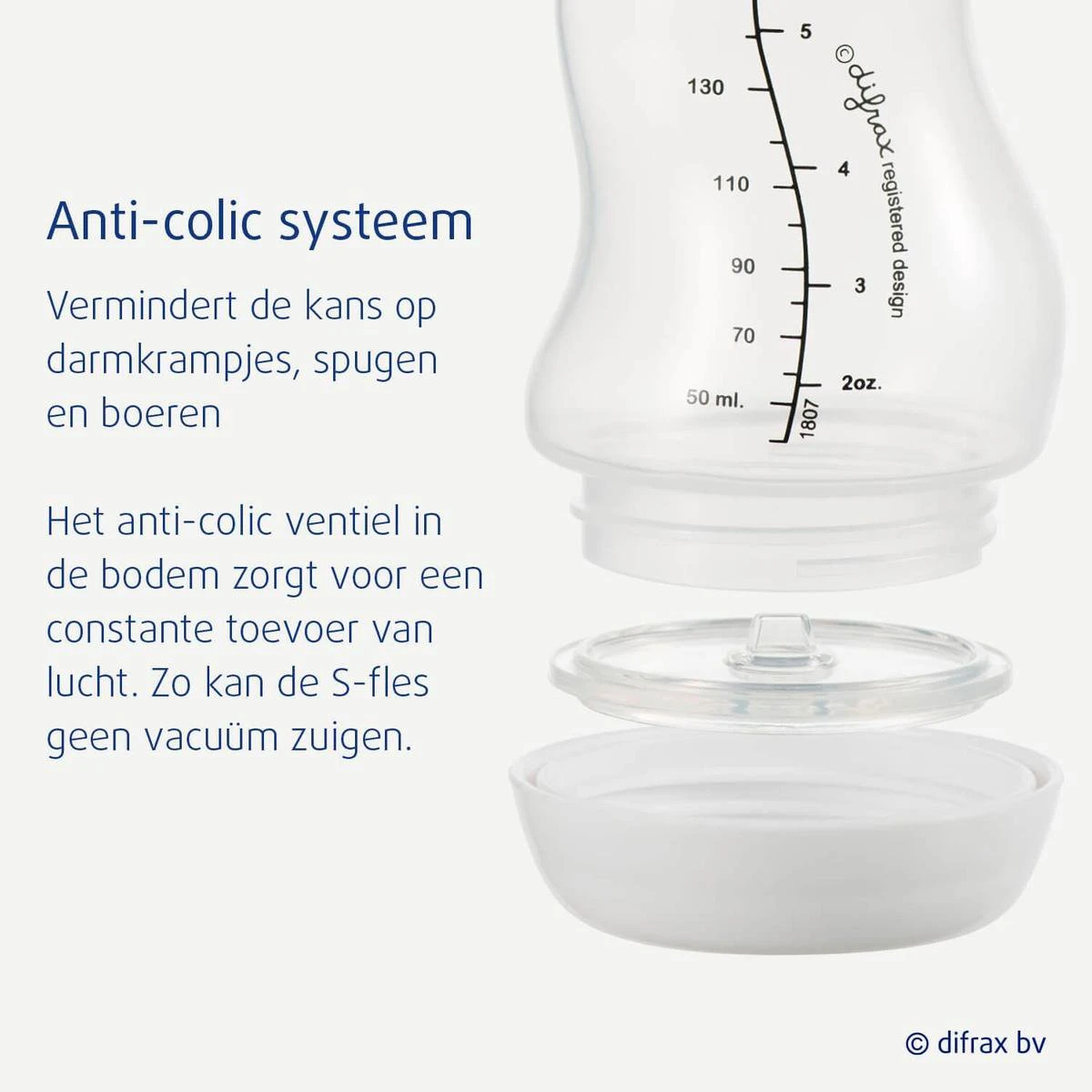 De best verkochte babyfles met anti-colic werking is geschikt voor maximaal 250 ml voeding en te gebruiken vanaf de geboorte. Door het anti-colic systeem in de bodem en de S-vorm van de fles, worden voeding en lucht niet met elkaar vermengd, hierdoor blijven vitamines en belangrijke voedingsstoffen behouden. Inclusief zachte Difrax flessenspeen Natural Small met extra grip voor je kindje. Let op: Controleer voor elk gebruik of het luchtgaatje in het midden van het ventiel open is door er enige malen in te knijpen.