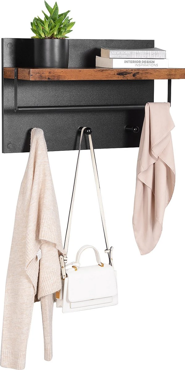 Met 3 knoppen kun je gemakkelijk een tas of rugzak op deze aan de muur gemonteerde kapstok hangen voor gemakkelijke opslag. De ophangstang is ideaal voor het ophangen van jassen en overhemden waar je liever geen schouderbobbels in wilt hebben. De bovenste plank is ideaal voor het plaatsen van sleutels, een portemonnee of kleine versieringen.