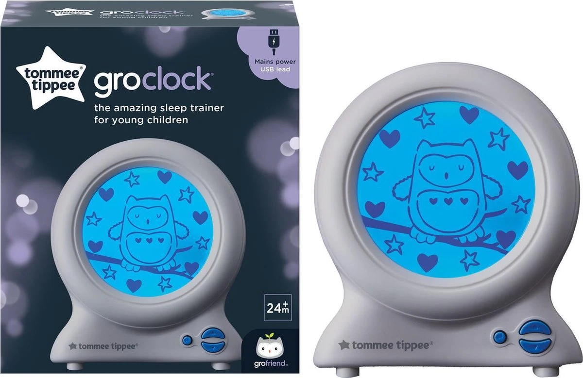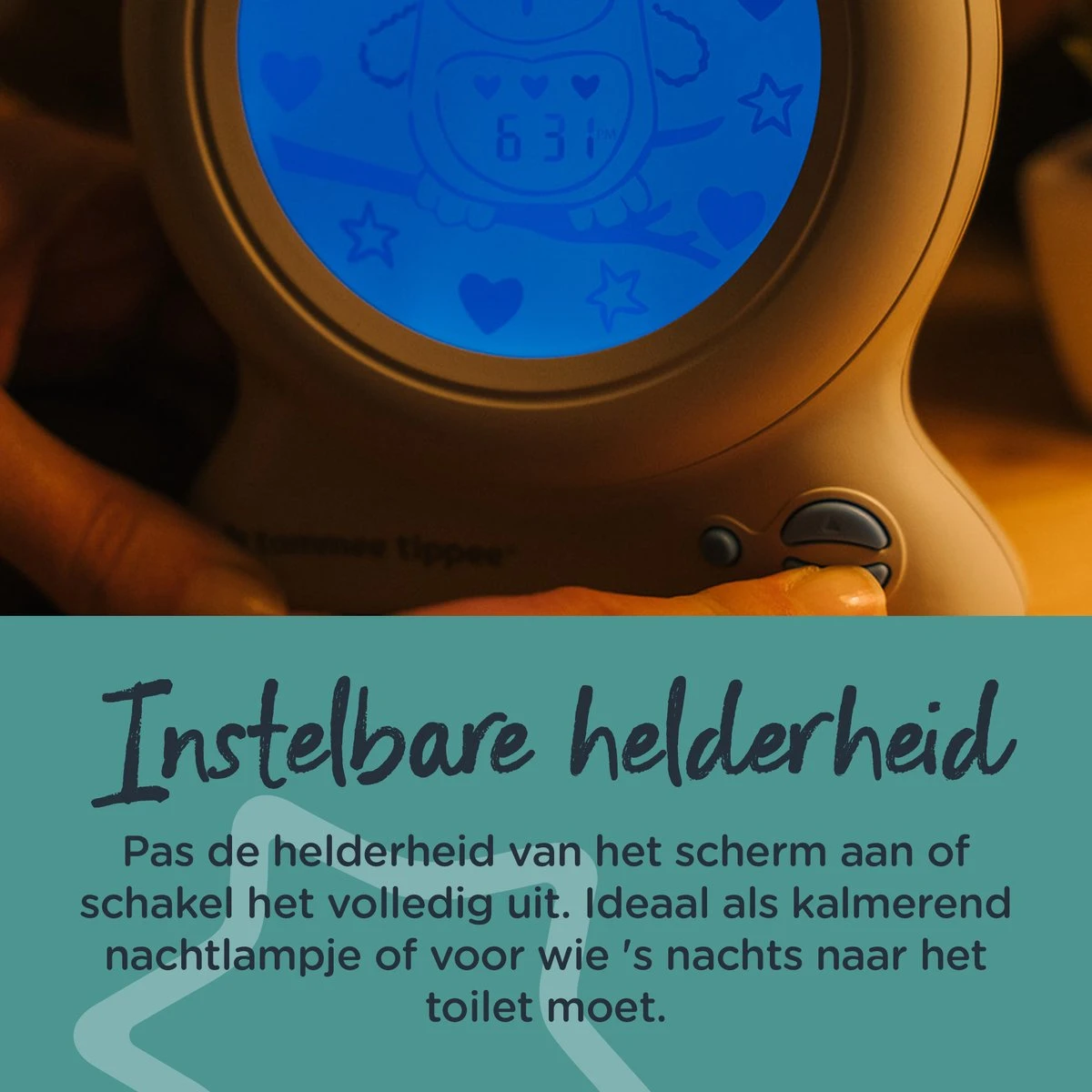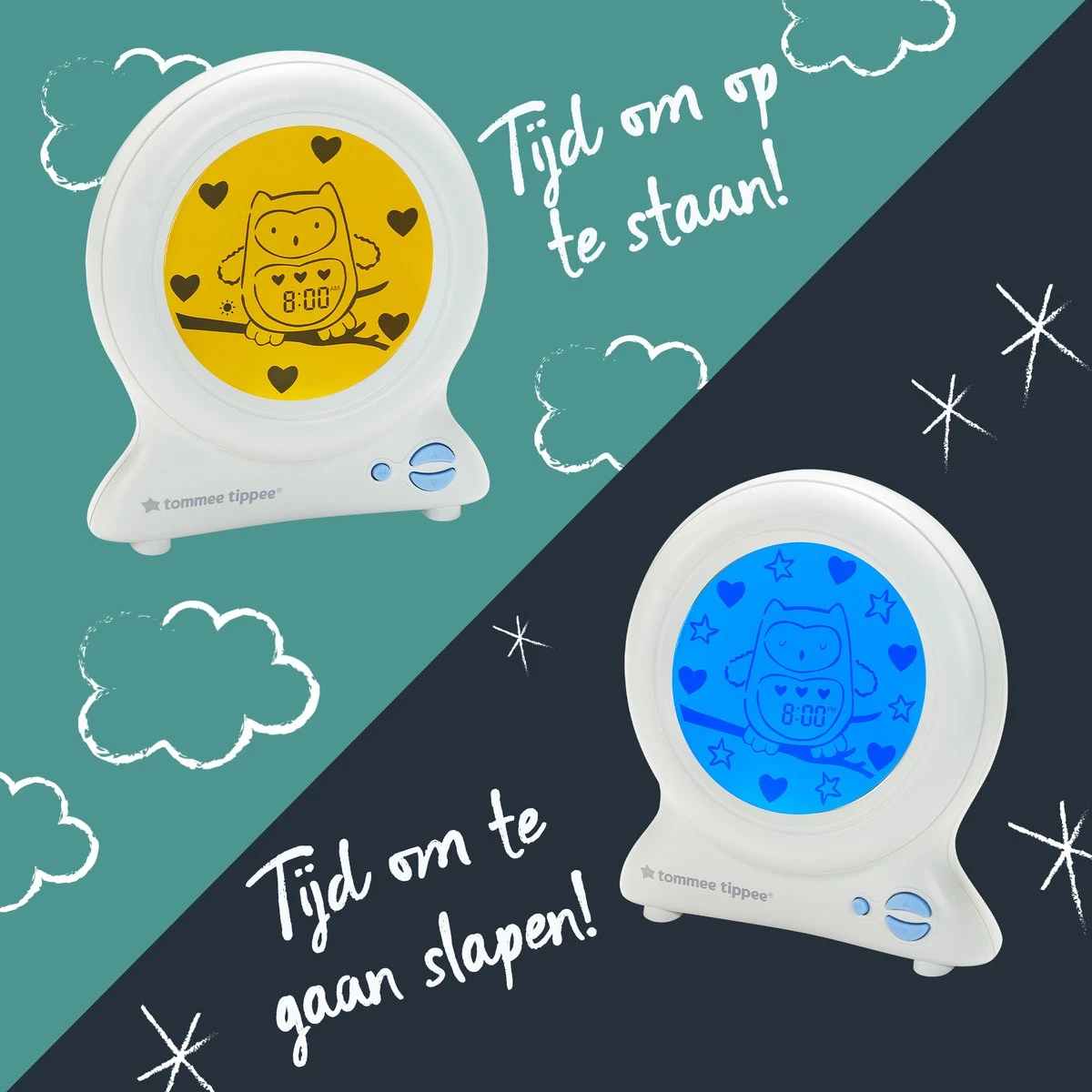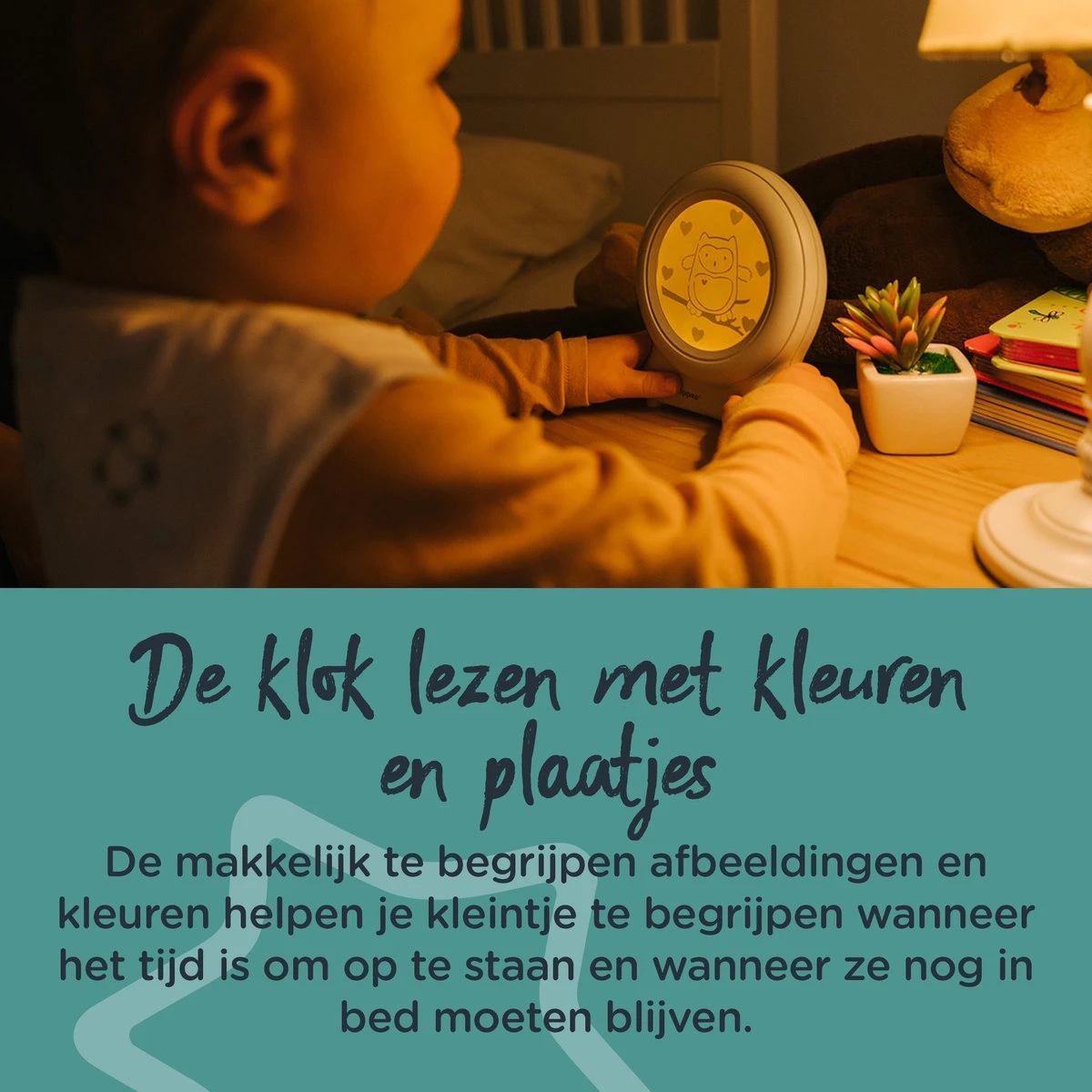 Hoe zorgt u ervoor dat uw kind begrijpt wanneer het tijd is om op te staan? De Tommee Tippee Groclock slaaptrainer gebruikt kleuren en afbeeldingen om kinderen die te jong zijn om een gewone klok te lezen, te helpen begrijpen wanneer het tijd is om te gaan slapen en wanneer het tijd is om uit bed te springen en te spelen! Stel eenvoudig de tijd in waarop u wilt dat uw kind ’s ochtends wakker wordt en deze slaaptrainerklok geeft het verstrijken van de tijd aan met behulp van kleuren en symbolen. Als het tijd is om te gaan slapen, is op de blauwe wijzerplaat een slaperige Ollie de Uil te zien, omringd door hartjes en sterren. Naarmate de tijd verstrijkt en uw vooraf ingesteld alarm wordt bereikt, beginnen de sterren geleidelijk te verdwijnen totdat er alleen nog maar hartjes over zijn en onze lieve Ollie de Uil wakker lijkt te zijn op een gele achtergrond. Met twee tijdinstellingsopties kunt u ervoor kiezen om verschillende alarmen voor weekdagen, weekenden of dutjes in te stellen. Met de instelbare helderheidsoptie stelt u de helderheid eenvoudig lager in of zet u hem helemaal uit. Naarmate uw kind groeit, kan de slaaptrainer ook worden gebruikt als een handig nachtlampje voor comfort en geruststelling of voor wanneer uw peuter ’s nachts naar het toilet moet. Naarmate kinderen ouder worden, kunnen ouders ervoor kiezen om het optionele hoorbare alarm in te stellen – perfect voor routinematige wektijden. Met de optionele digitale klokfunctie kunnen ouders ook de digitale klok weergeven – ideaal voor als uw kind digitaal klokkijken begint te leren. De slaaptrainerklok wordt gevoed door een 3,5 mm USB-oplader*, dus er zijn geen batterijen nodig (*exclusief adapterstekker, maar compatibel met de meeste USB-stekkers die worden gebruikt als telefoonopladers). Bij Tommee Tippee ontwerpen we producten die het leven van drukke gezinnen eenvoudiger maken. Met ons snelgroeiende Sleep-assortiment helpen we gezinnen met de grootste uitdaging van het vroege ouderschap: een goede nachtrust. Tommee Tippee’s collectie nachtkleding en slaaptrainers, zoals onze Groclock, Groegg en lieve Grofriends, bieden ouders volledige gemoedsrust – zodat u allemaal wat welverdiende rust kunt krijgen.