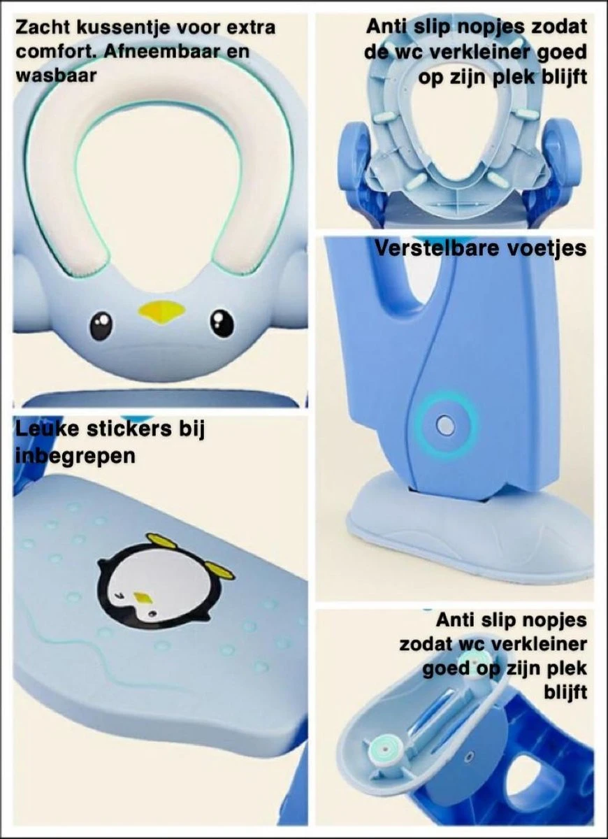 Bent u al die luiers verschonen meer dan zat? Wordt het tijd dat uw peuter zijn of haar behoefte leert te doen op de toilet? Dan is deze opvouwbare toilettrainer ideaal voor u! Met deze toilettrainer kunt u uw peuter leren naar de Toilet te gaan. Dankzij het opstapje/trappetje (verstelbaar in 2 standen), kan uw peuter gemakkelijk bij de wc komen. Ook zit er een zacht rubbere ´wc bril´ bij die u eventueel eraf kan halen en wassen indien de kleine bengel toch nog een beetje mis mikt.