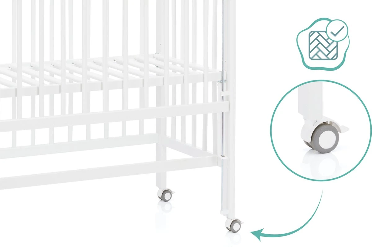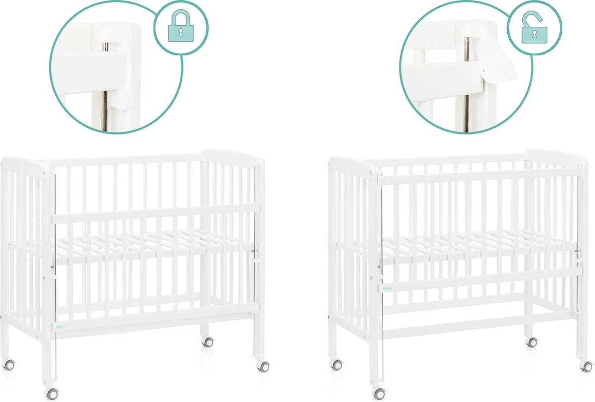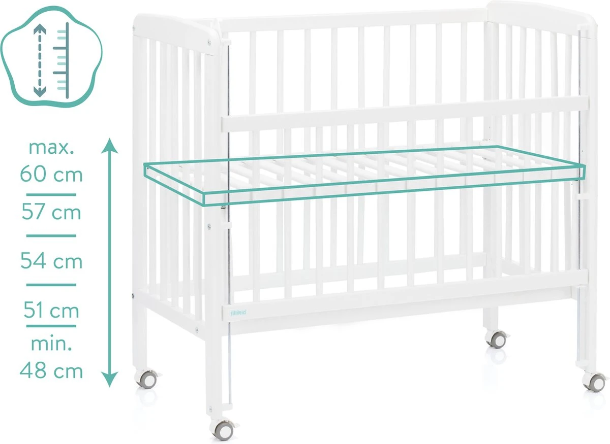 Voor gebruik als wiegje kunt je het zijdeel in één handomdraai naar boven trekken en vervolgens eenvoudig en stil door het huis duwen op de wieltjes.